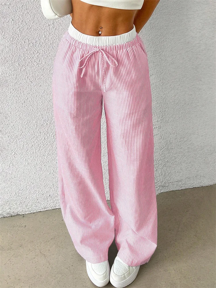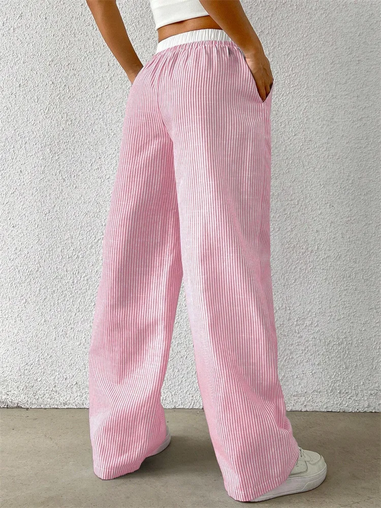 These striped woven pants offer a relaxed yet stylish look for fall and winter. The wide-leg design provides a comfortable and flattering silhouette. Their full-length cut keeps you warm while maintaining a chic appearance. The woven texture adds depth and visual interest to the outfit. Inspired by streetwear and Y2K fashion, they bring a trendy touch to casual wardrobes. The soft material ensures easy movement throughout the day. These pants pair effortlessly with sweaters, tees, or fitted tops. Their casual style makes them perfect for everyday outings and relaxed weekends. The stripe pattern elongates the legs for a sleek look. These trousers are ideal for women who want comfort and fashion in one piece.