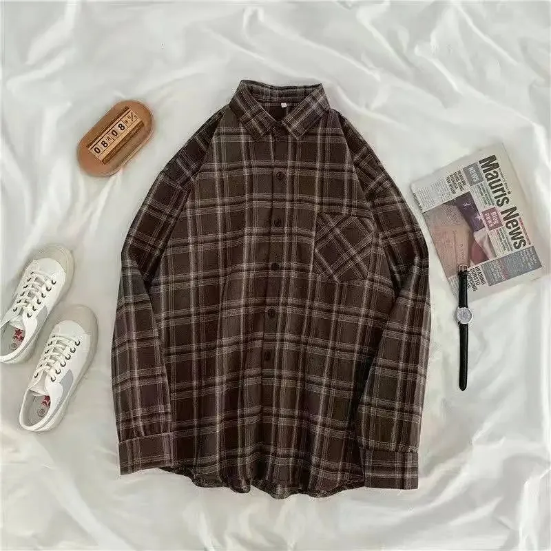 This vintage plaid shirt offers a stylish blend of comfort and personality. The oversize fit creates a relaxed and effortless look. Its long sleeves make it perfect for cool autumn days. The button-up design adds versatility for layering and styling. Soft fabric ensures all-day comfort for casual outings. The plaid pattern gives the top a timeless, classic appeal. It pairs beautifully with jeans, leggings, or skirts. Inspired by Korean fashion, it brings a trendy and modern touch. The shirt can be worn as outwear or as a standalone top. This piece is ideal for creating cozy and fashionable fall outfits.